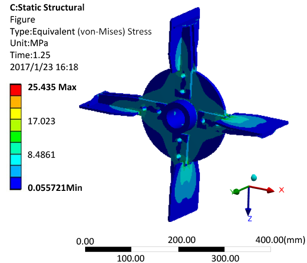 Under the combined action of the above loads, the equivalent stress of the impeller underthe unloaded state is calculated by using the finite element method as shown in Figure 1. By using the post-processing tools in the Workbench software, the maximum stress is detected, which is 25.435MPa at the junction of the blade root and the stiffener. This is due to the stress concentration caused by the sharp change of the geometric shape and the thickness at thejoint.