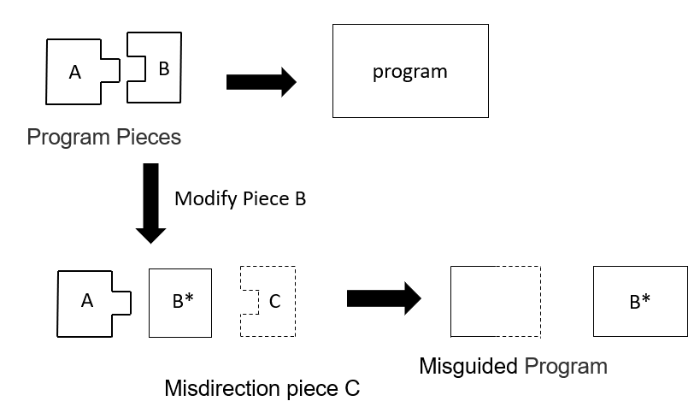 Misleading: misleading is an enhancement of the above two methods in crowdsourcing software testing. The idea of this kind of method is to guide the attacker to restore another target program. The main goal of this kind of method is to change the result that can be restored into another misleading result (Figure 11).