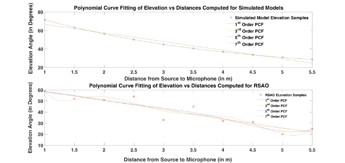 A ground reflection direction is represented as an ordered pair of azimuth and elevation angles. As the sound source is in line with the microphone, ideally the azimuthal angle should be zero. But when extracted from the measurement, the computed azimuth varies as shown in Figure 2. It hovers around zero degrees. Elevation angle variation is very important in analyzing the ground reflections. As shown in Figure 1, the elevation angle decreases with an increase in distance between source and microphone. The angle subtended by the microphone with the horizontal axis (computed in RSAO) is the same as the angle subtended by the reflection with the ground (computed in Simulation model using Equation 1). The elevation angle computed through RSAO and the angle computed using Equation 1 are shown in Figure 3. As the latter exhibits a closed form expression, the monotonic nature of the curve can be seen in Figure 3. However, the measured elevations have fluctuations that make the task of identifying parameters for non-measured directions difficult. The solution explored in this work for this problem is to apply a polynomial curve fitting. Figure 4 illustrates the elevation angles as scattered points obtained for simulated (top) and RSAO (bottom) for 10 different distances used in the Classroom database. It also illustrates the polynomial curve fitting of order 1, 3, 5, and 7 performed on the 10 sampling points. Because of the monotonic variation of elevation angle for the simulated model, the lower orders were able to successfully model the sampling points. However, the elevation angles obtained using RSAO need a higher order for proper generalization of sampling points. It can be seen that increasing the order attempts to fit the data. However, PCF orders greater than 5 creates over-fitting of the data, which can be observed from